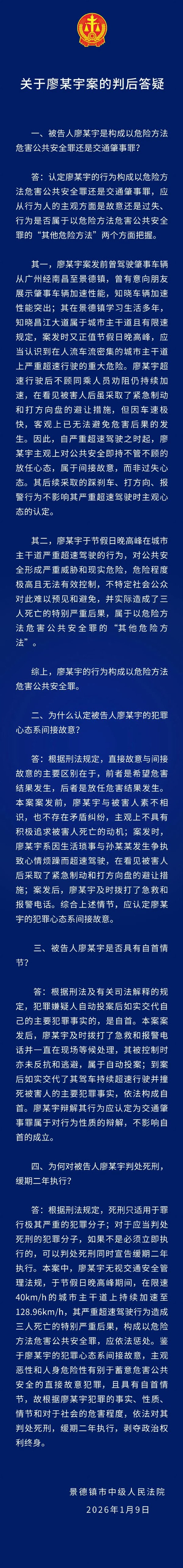 景德镇市中级人民法院判决:廖某宇以危险方法危害公共安全案一审公开宣判,和女缓对被告人廖某宇以以危险方法危害公共安全罪判处死刑,架撞缓期二年执行,口审剥夺政治权利终身。判死